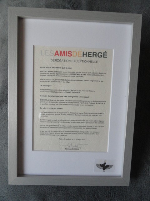 Le Président des Pélicans Noirs, Jérôme Dufort, s’est vu attribué en mars 2022, une dérogation exceptionnelle par Philippe Goddin, président des « AMIS DE HERGE » , pour pouvoir poursuivre , au delà de ses 77 ans, la lecture de l’ œuvre de Hergé et en particulier les aventures de Tintin. Le Président en a été fort aise et fort soulagé.
